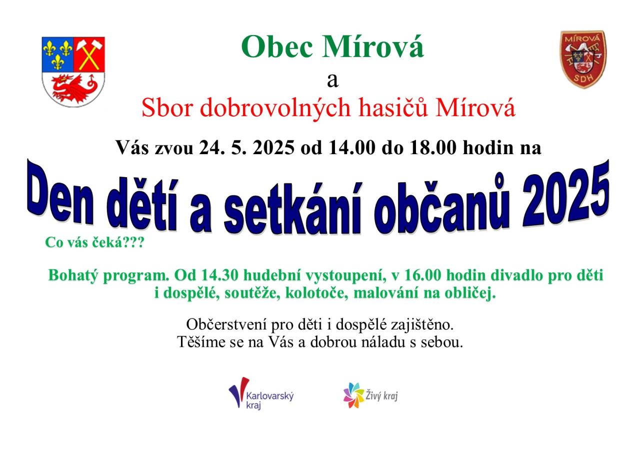 Obec Mírová a Sbor dobrovolných hasičů srdečně zvou na Den dětí a setkání občanů, které proběhne 24. května 2025 od 14.00 do 18.00 hodin. Na programu je bohatá nabídka aktivit včetně hudebního vystoupení, divadla pro děti i dospělé, soutěží a kolotočů. Občerstvení je zajištěno pro malé i velké, a proto neváhejte a přijďte strávit příjemné odpoledne plné zábavy.
